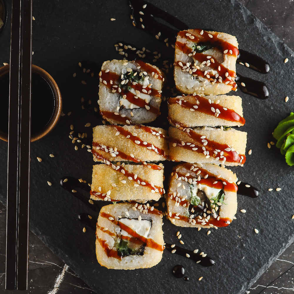 Фирменный ролл. В составе: печеный угорь, сыр Креметте, водоросли чука, унаги соус, кунжут, кляр. Подается тёплым.