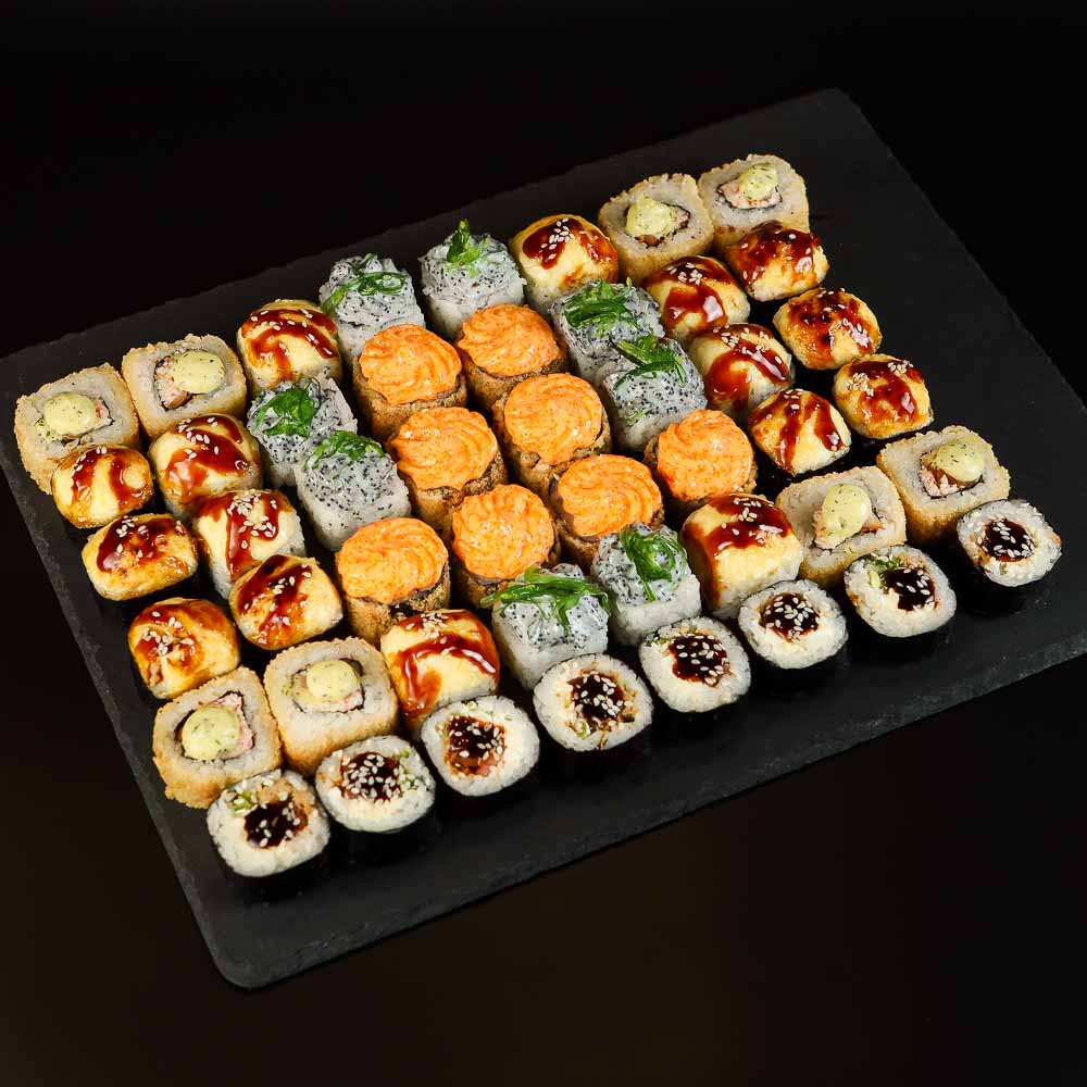 Сливочный Чикен, Лава с креветкой, Запеченный Лосось Терияки, Запеченный Краб, Лава Темпура, Чикен Темпура. 6 видов ролл, 48 штуки.