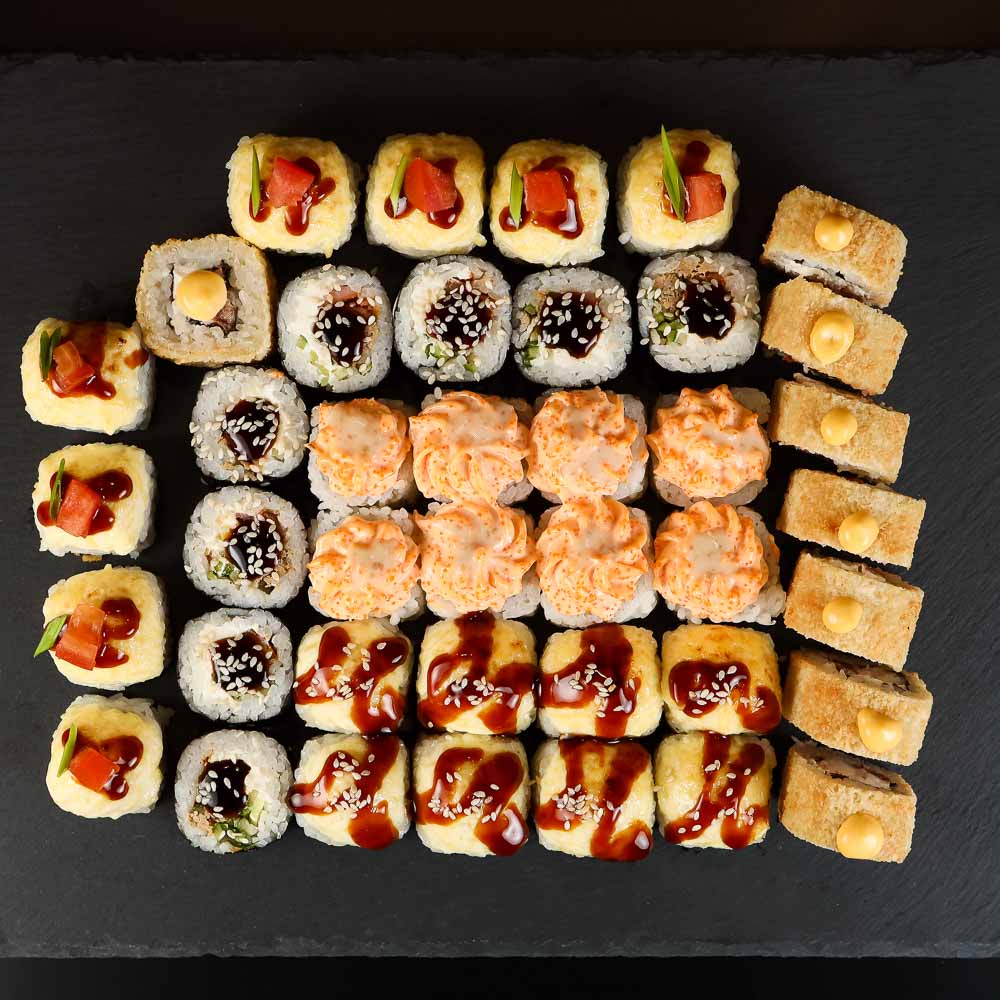Сливочный Чикен, Нячанг, Запеченный Хищник, Эби Краб, Эби Чиз Темпура. 5 видов ролл, 40 штук.