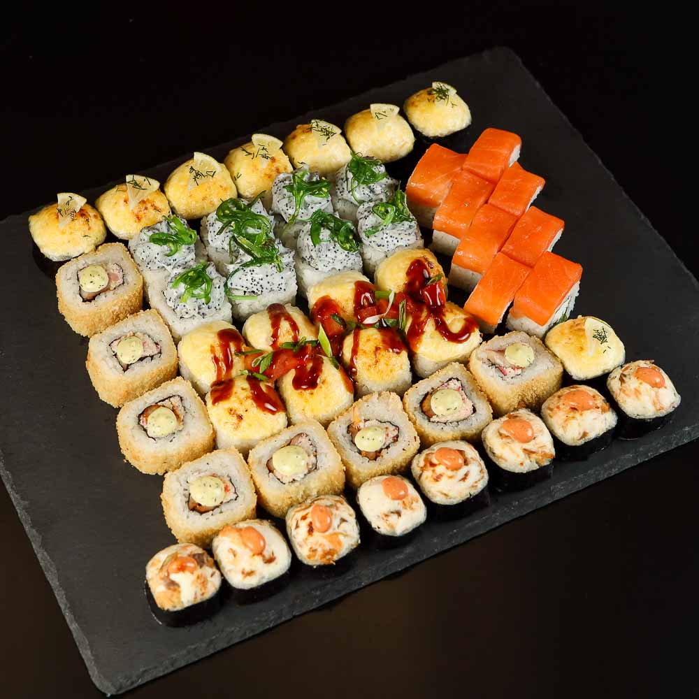 Лава с креветкой, Везувий, Филадельфия Лайт, Запеченный с креветкой и лаймом, Эби Краб, Чикен Темпура.6 видов ролл, 48 штук.
