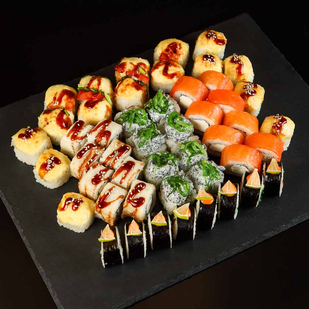 Филадельфия, Унаги Онигара, Посейдон, Лава с креветкой, Эби Краб, Запеченный Лосось терияки. 6 видов ролл, 48 штук.