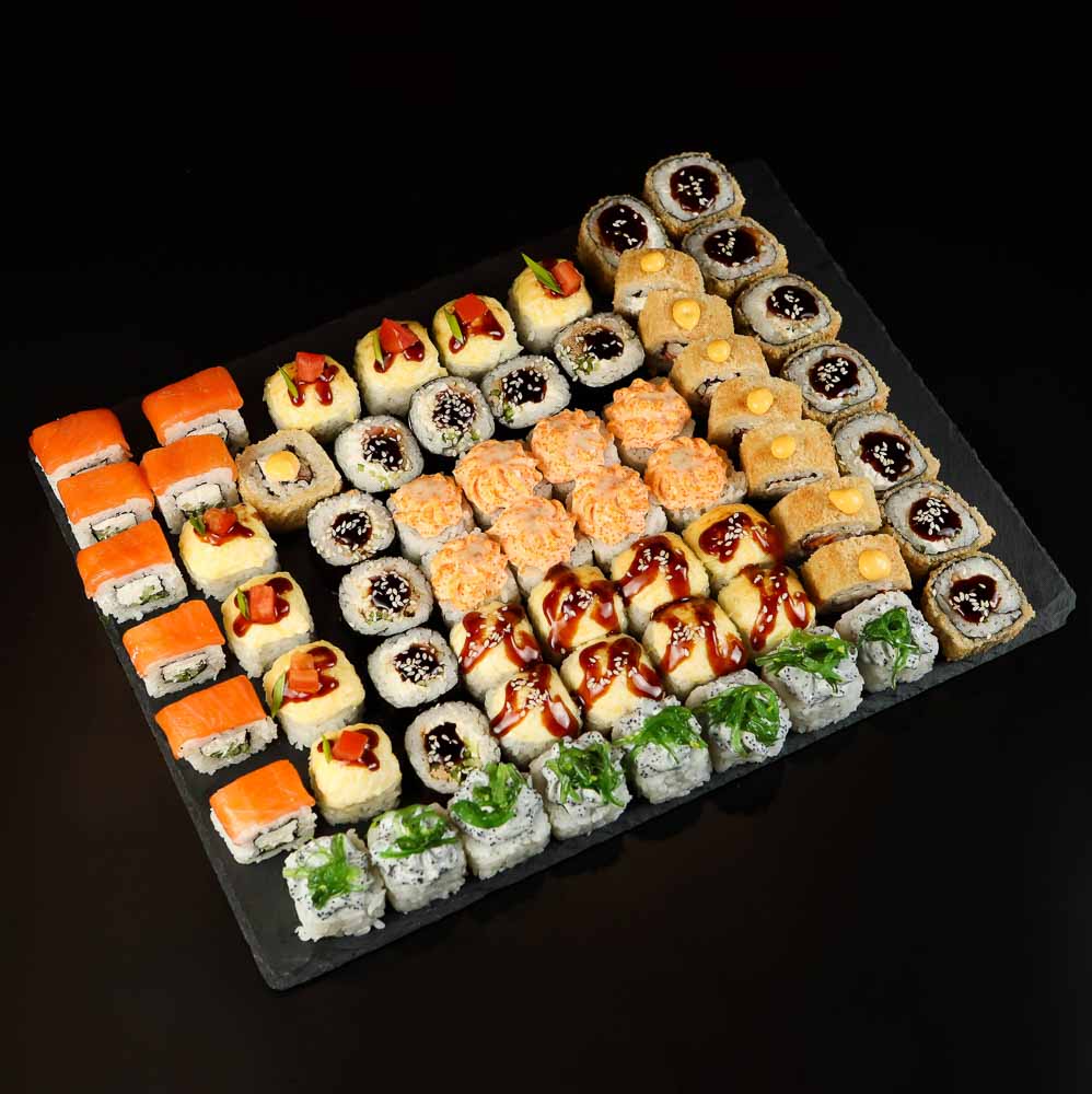 Сливочный Чикен, Нячанг, Лава с креветкой, Филадельфия Лайт, Запеченный Хищник, Эби Краб, Эби Чиз Темпура, Чикен Темпура. 8 видов ролл, 64 штуки.