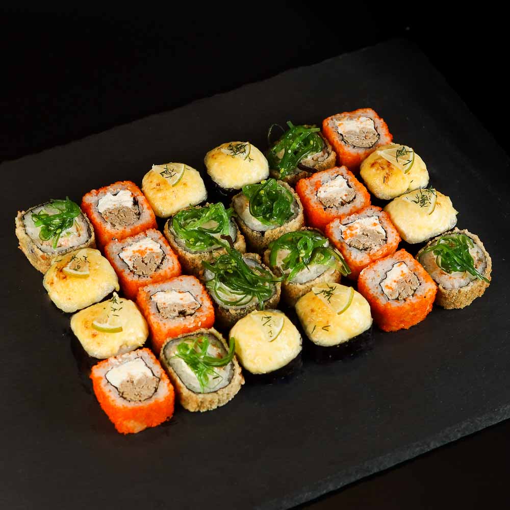 Оранж, Запеченный с креветкой и лаймом, Yammy темпура. 3 вида ролл, 24 штуки.