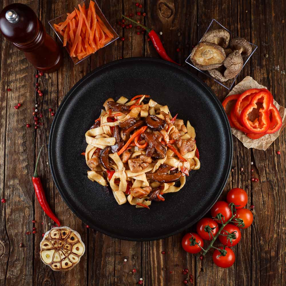 Карамелизированные овощи (морковь, перец), обжаренные с куриным филе бедра, с добавлением грибов Шиитаке. И всё обжарено с удоном, шрирачей и соевым соусом. Небольшая остринка.